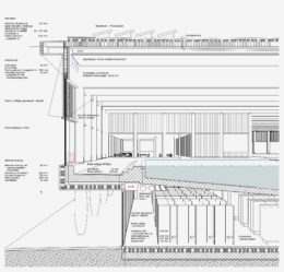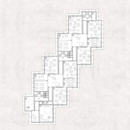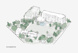 Vor- und Rücksprünge beim Neubau spielen zusammen mit den Annexen des Bestandes und unterteilen den Zwischenraum in der Länge. Die Vorsprünge des Neubaus drehen sich leicht aus der starren Geometrie heraus und lockern den Zwischenraum auf. Sie beinhalten in den Enden die Nebenräume sowie mittig die Erschliessung