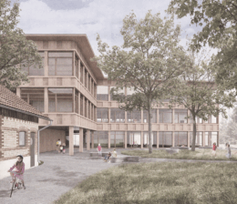 Mit einem Satteldach fügt es sich nicht nur gut in die bestehenden Schulbauten sondern auch in die gängigen Bauform der Genossenschaftsbauten ein. Speziell wurde auch auf die Ausbildung von schmalen Stirnfassaden wert gelegt, damit sich der neue Trakt gut in das Schulensemble integriert und alt und neu zusammen eine neue Einheit formen. Mit seinen drei Geschossen hält er in etwa die Höhe der bestehenden Bauten und dient ebenfalls der Integration in die Nachbarschaft. Die grosse, gegen Süden geneigte Dachfläche ist mit einer PV-Anlage Teil des ökologischen Konzeptes.