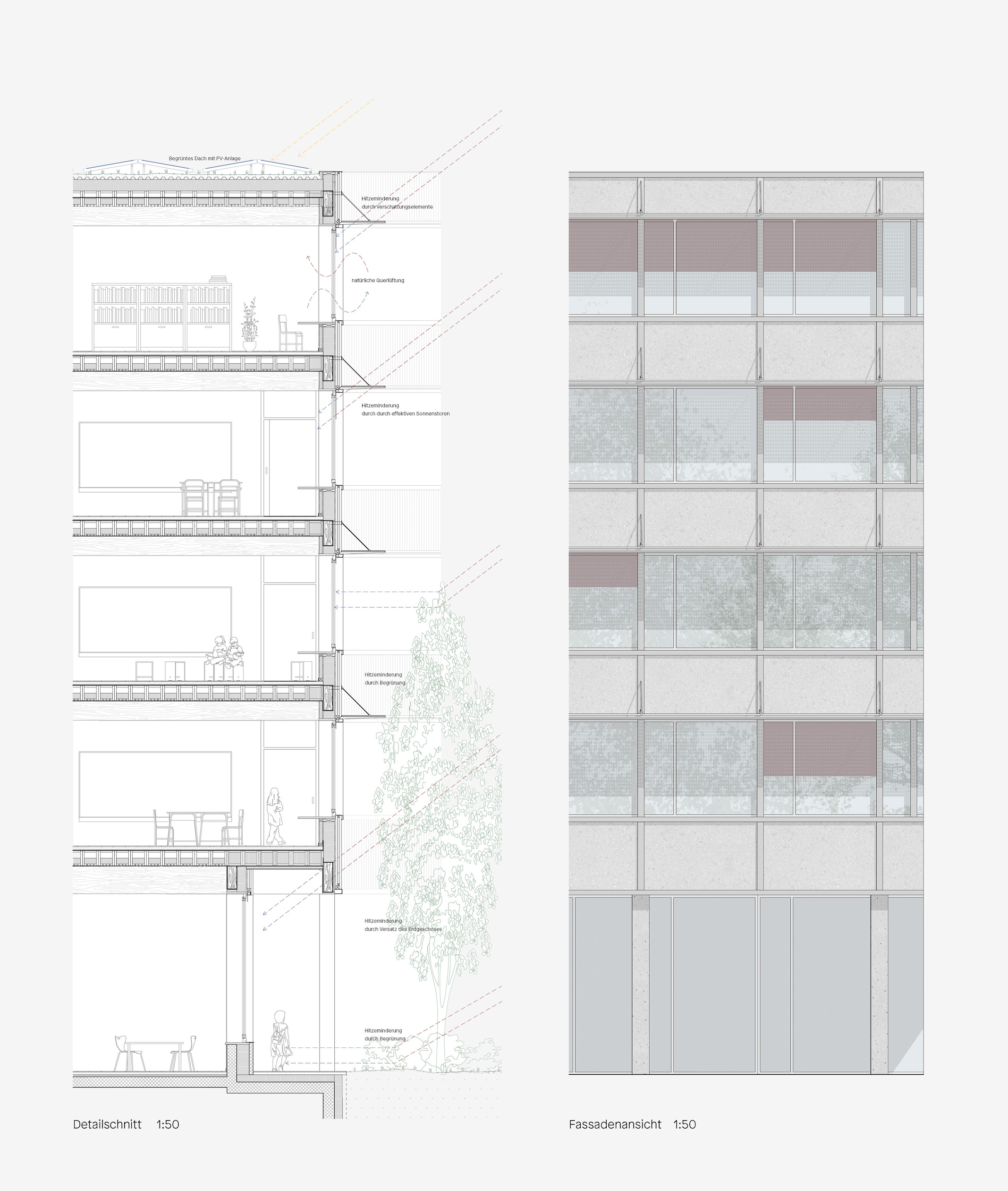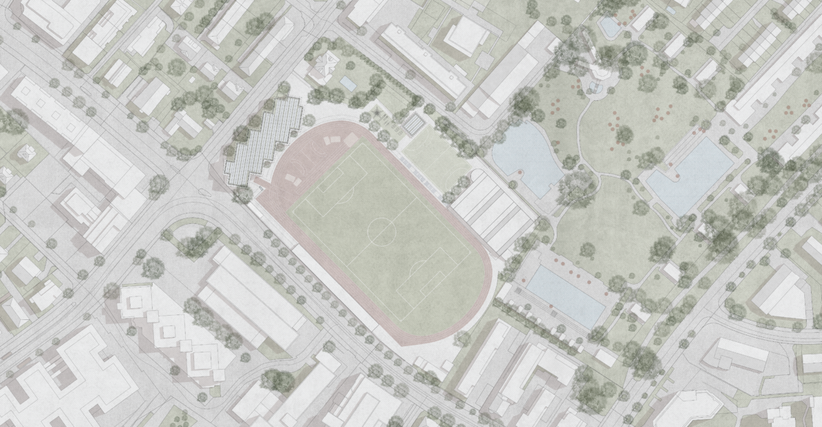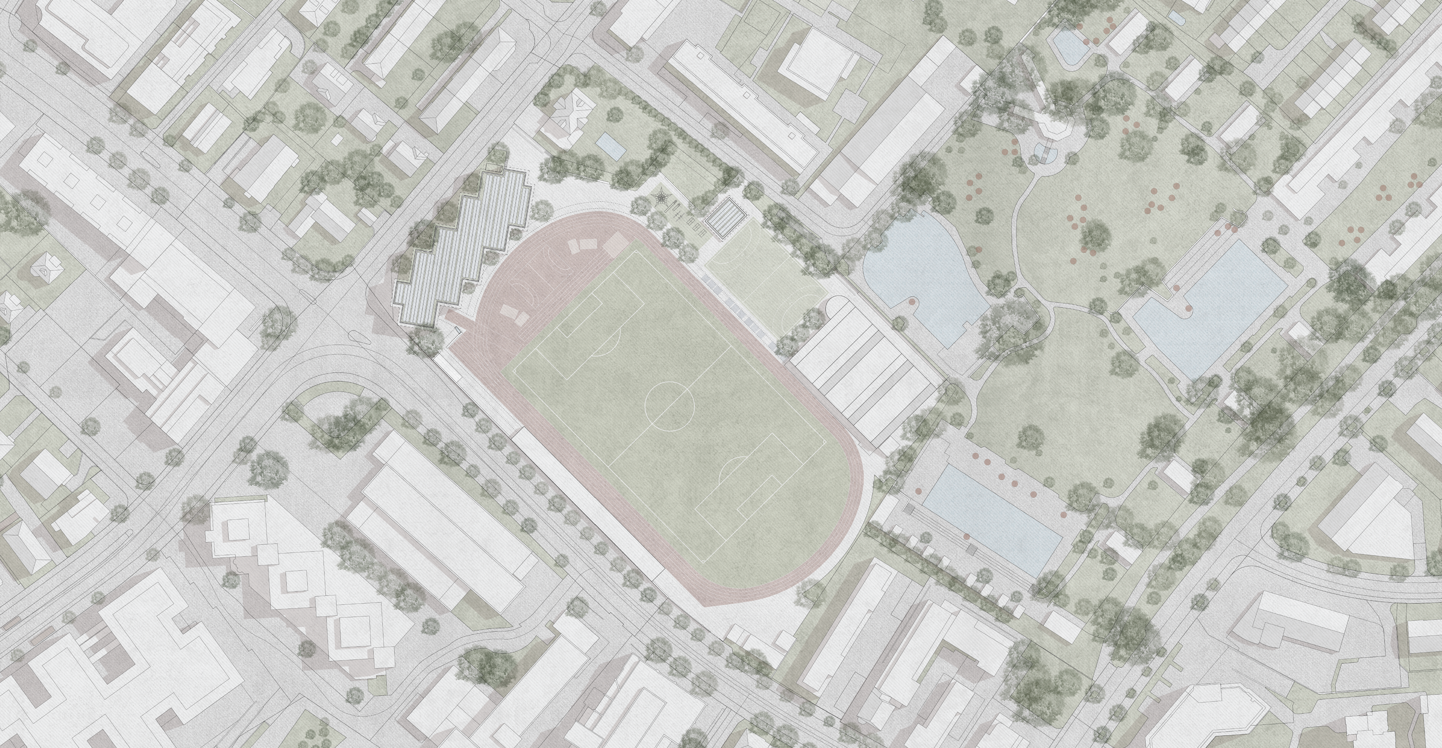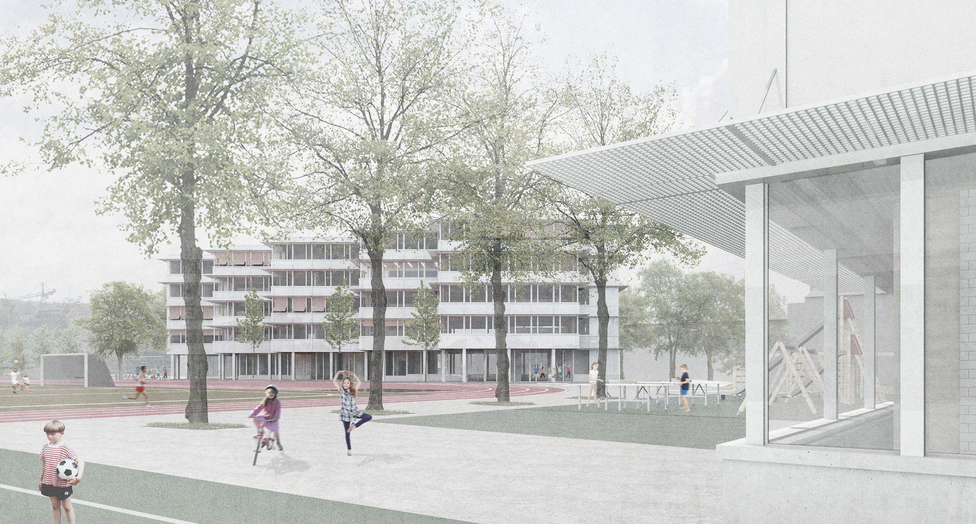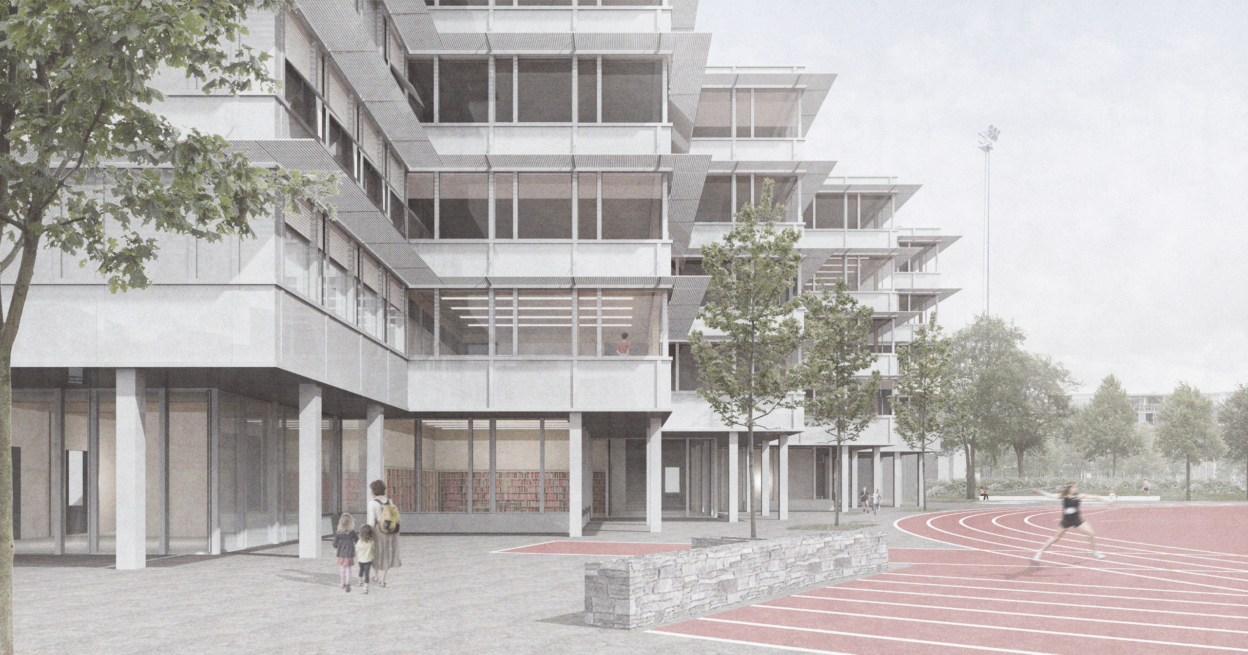 Der Neubau an der Dennlerstrasse erhält die grosszügige Freifläche von Uto- und Letzigrund und reagiert mit einer klaren, lärmoptimierten Gebäudefigur auf die komplexe städtebauliche Situation. Durch die geschickte Orientierung des Baukörpers entstehen ein geschützter Pausenplatz sowie eine klare Adressierung an der Strassenkreuzung.