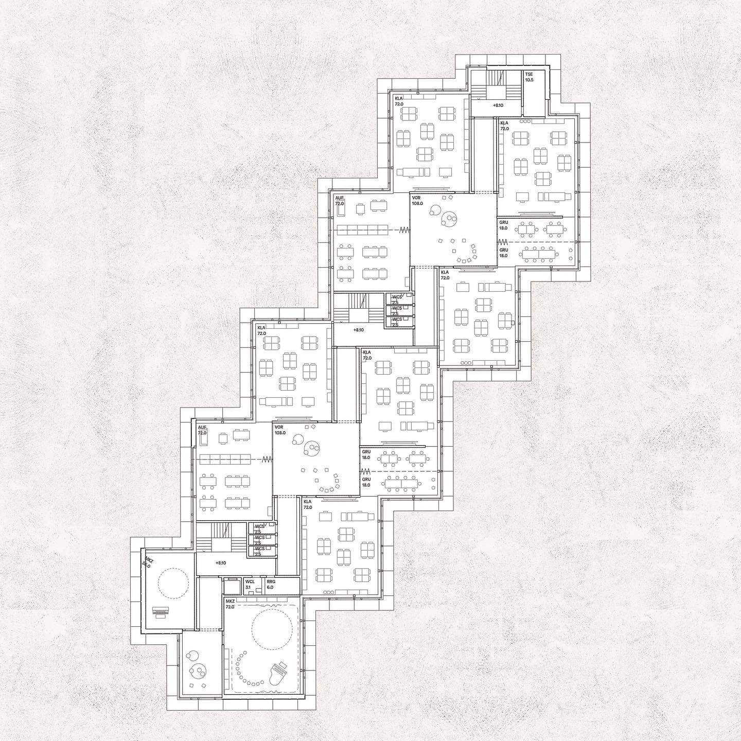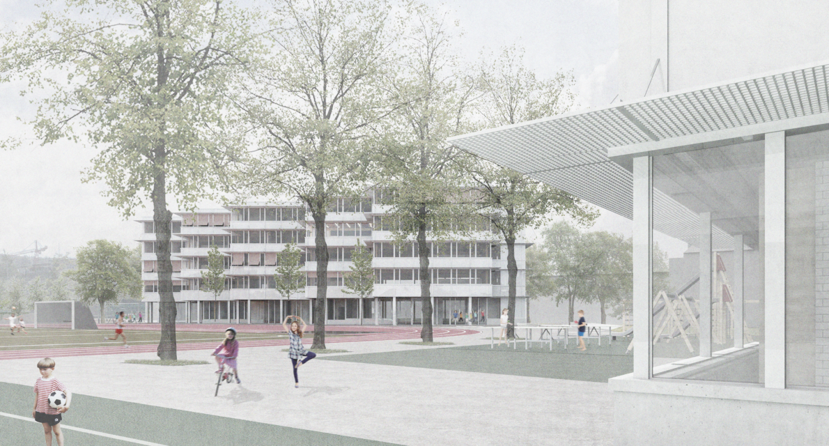 Die Schule ist kindgerecht organisiert: drei Eingangshallen führen zu flexibel nutzbaren Lernclustern, grosszügigen Garderobenzonen und lichtdurchfluteten Aufenthaltsflächen. Die Sportnutzung konzentriert sich auf der Nordostseite und bildet mit der unterirdischen Zweifachsporthalle und einem neuen Pavillon ein funktionales Ensemble.