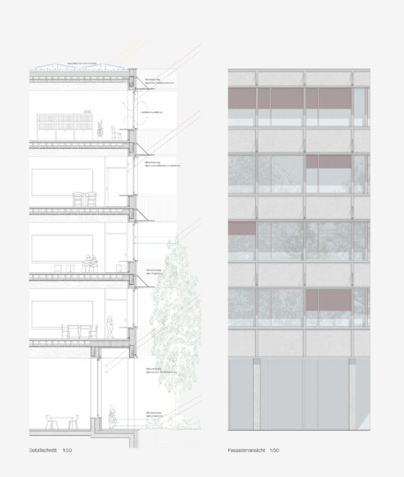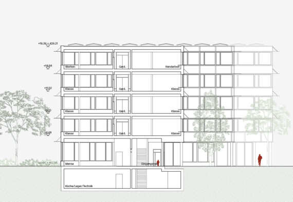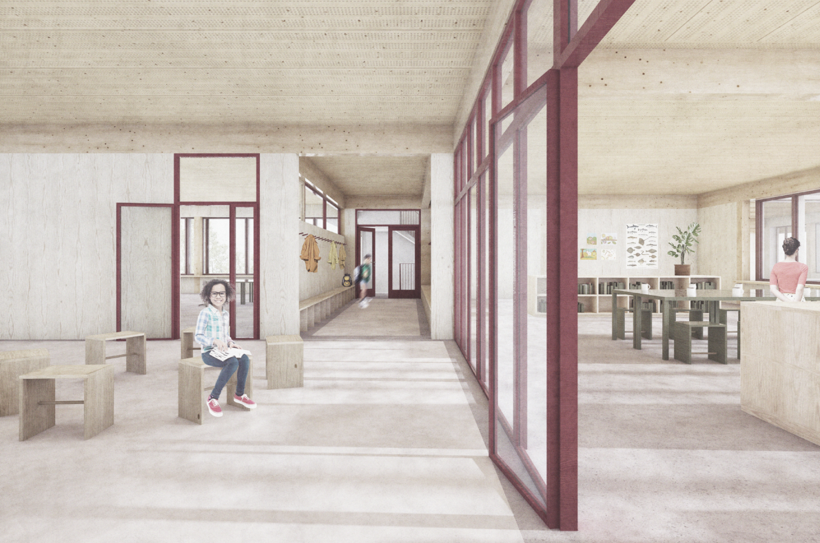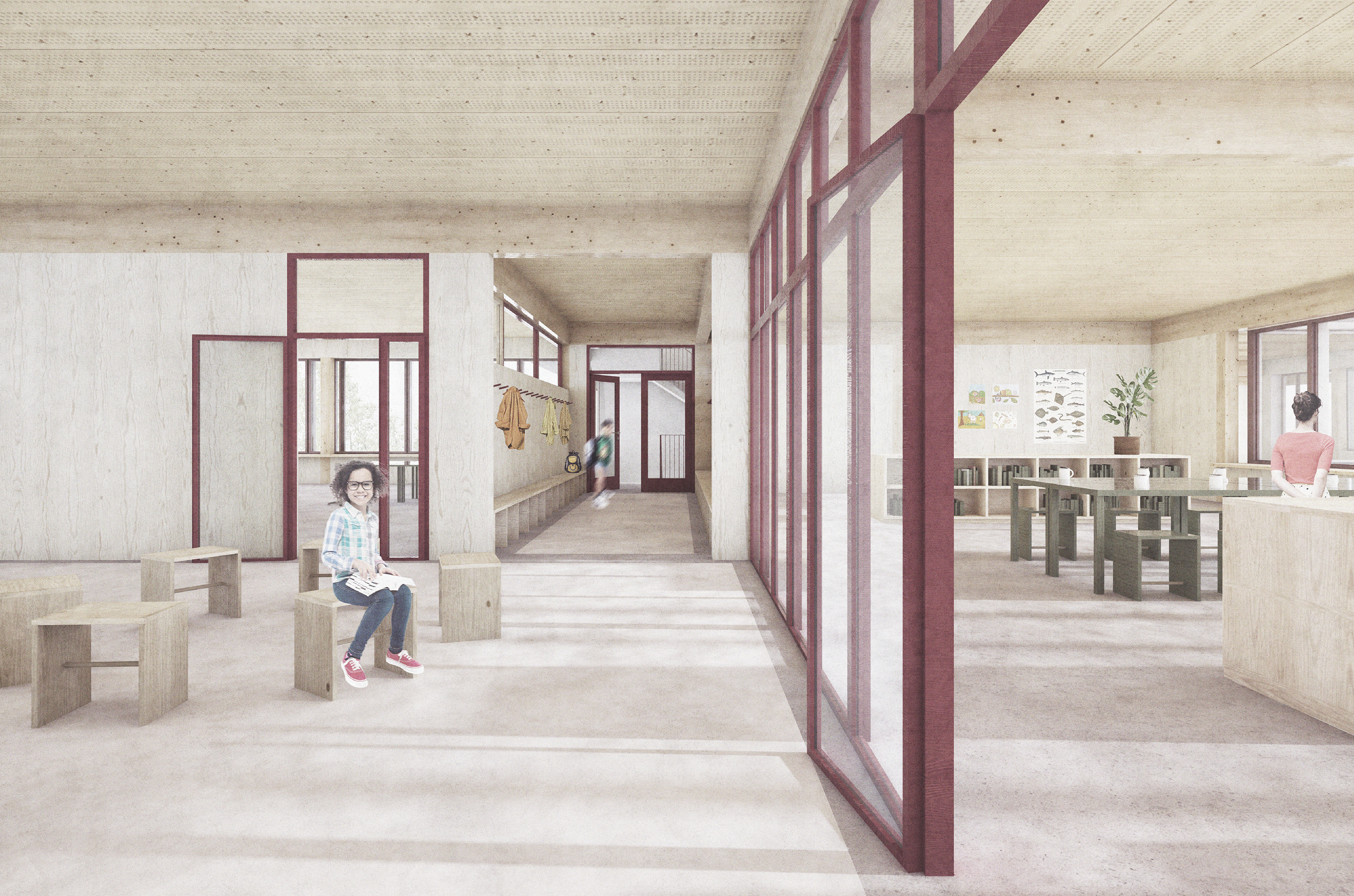 Das Projekt setzt auf Low-Tech-Lösungen, natürliche Belüftung, helle Oberflächen und nachhaltige Materialien wie Holz und Recyclingbeton. So entsteht ein langlebiges, ressourcenschonendes Schulhaus mit hoher Aufenthaltsqualität und einem starken Bezug zur umgebenden Freifläche.